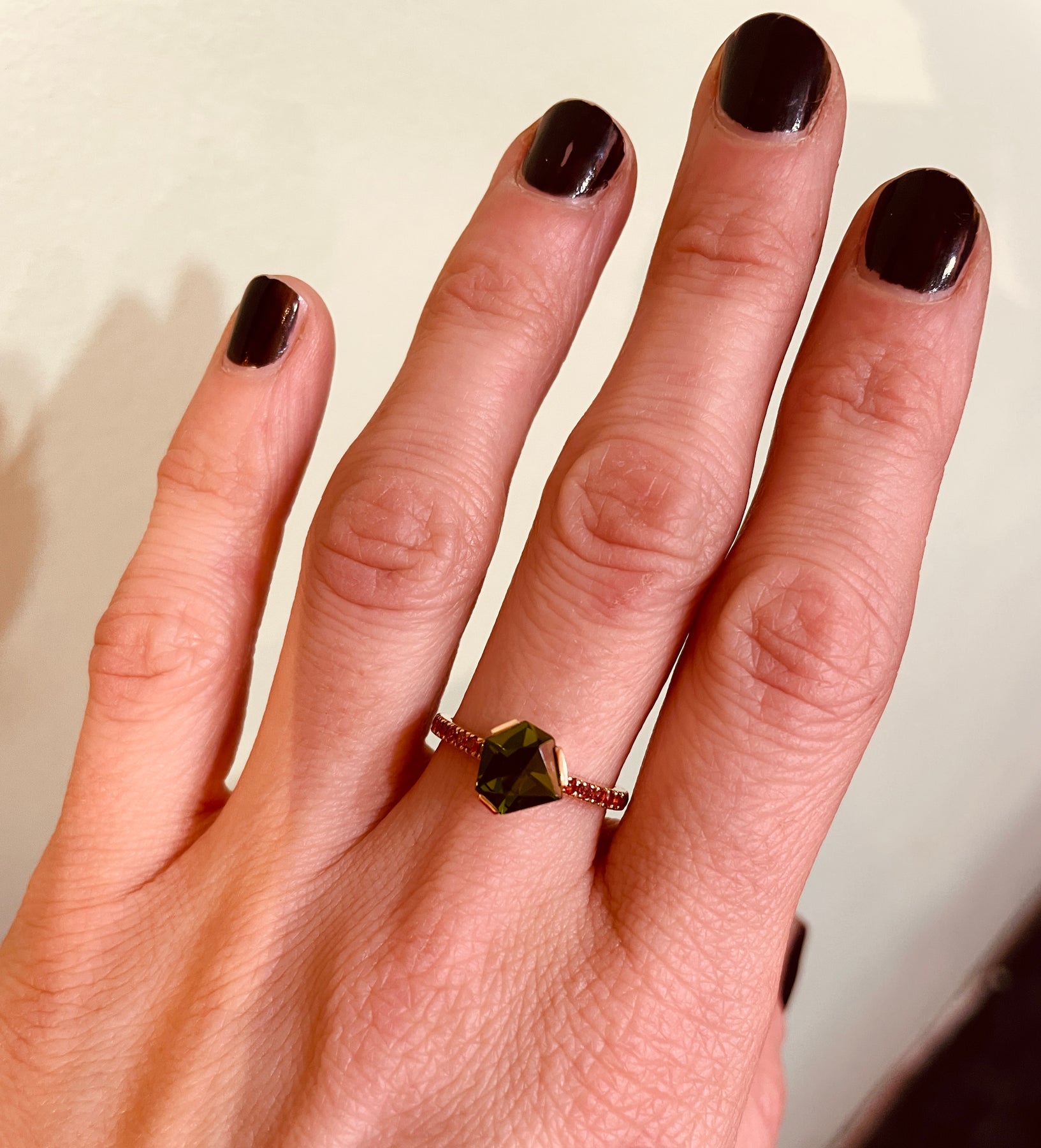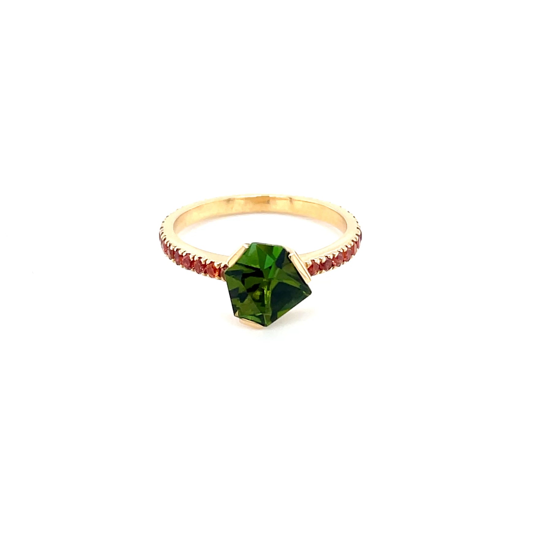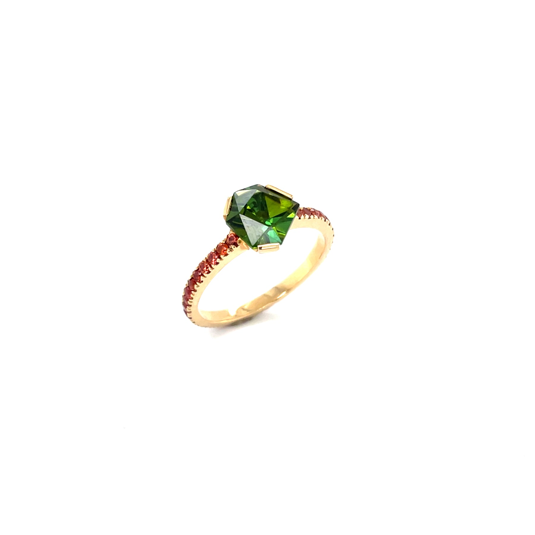 Ring aus 18kt Gelbgold mit einem grünen Turmalin im 21st Century Cut Schliff und orangenen Safiren