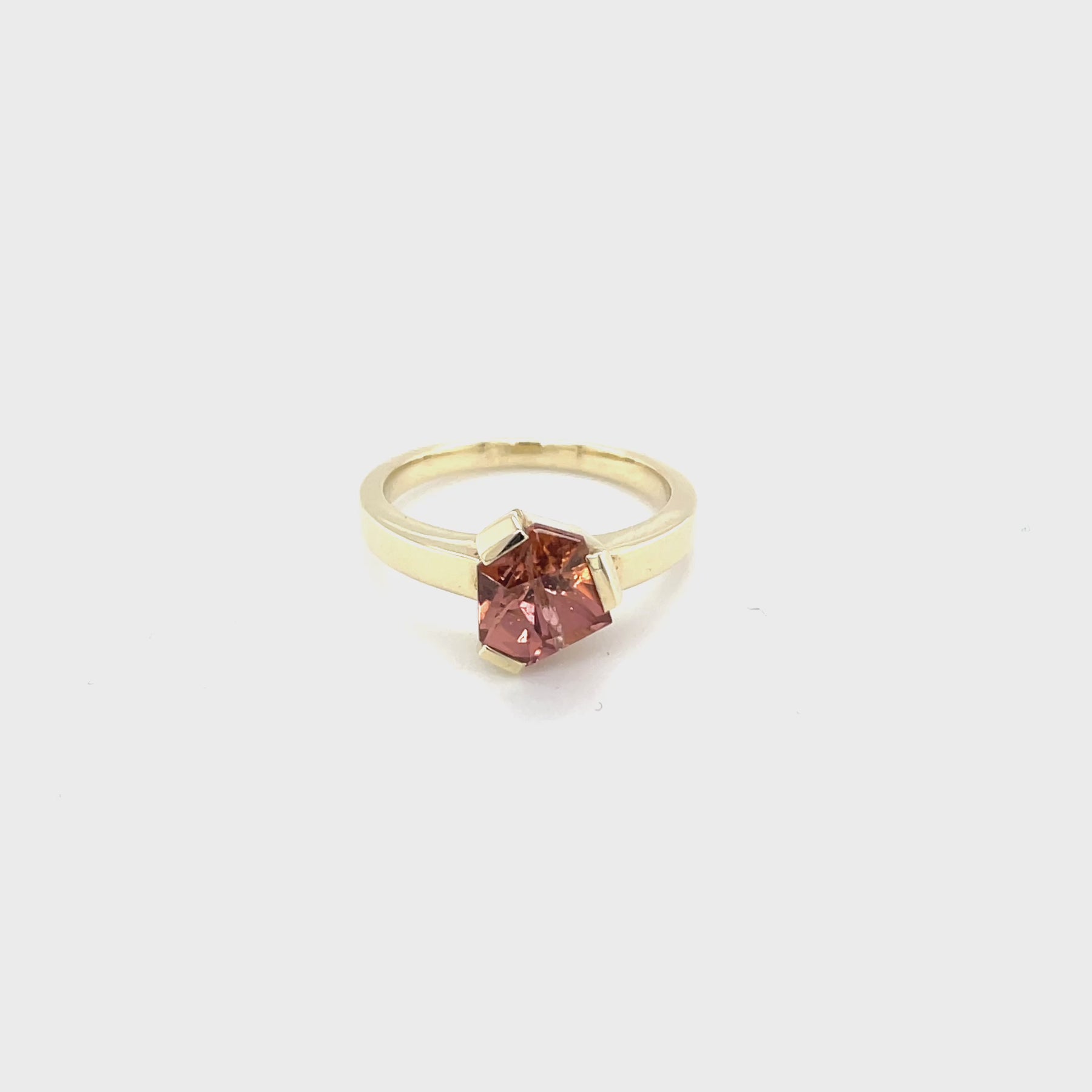 Ring aus 8kt Gelbgold mit einem rosafarbenen Turmalin im 21st Century Cut Schliff und einem kleinen Diamanten im inneren der Ringschiene: For your eyes only!