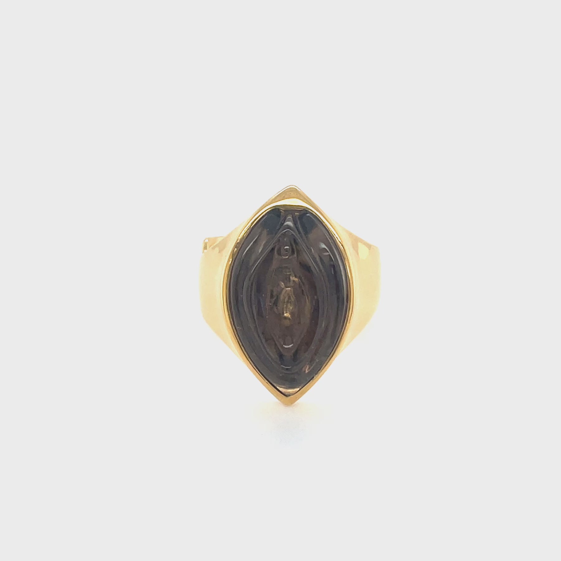 Ring aus goldplattiertem Messing (auf Anfrage auch in rhodiniert verfügbar) mit Vulva aus Epoxidharz gegossen.